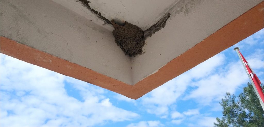 Okulumun girişinde bulunan kırlangıç yuvası.. İlk geldiğim zamanlarda sıradan bir serçe yuvasıydı ve içindeki yavruları rahatlıkla görebiliyordunuz. Aynı yıl serçelerin yuvadan ayrılmasıyla bir kırlangıç ailesi göçtü ve uzun süren tadilat çalışmaları sonrasında yuvanın üstüne bir çatı daha ekleyerek her bir tarafı kapattılar ve sadece yuvarlak bir kapı bıraktılar kendileri için. Yine de gagalarını açmış çığrışan ve annelerinden yiyecek bekleyen mucize yavruları görebiliyordum bir merdivenin yardımıyla. Fakat nazarımdan korkan kırlangıç ailesi oldukça kısa bir sürede o yuvarlak girişin önüne uzun bir koridor ekleyiverdi. Sadece benim nazarım yüzünden değil elbette bu tedbir: Etrafta tavuk kapan cinsten atmacalar, saksağanlar ve aklı koca karga dostlarım da varlar. En azından çok sessiz bir zamanda yavruların sesini duyabiliyordum. Bu yıl girişteki koridor biraz daha uzatılmış…